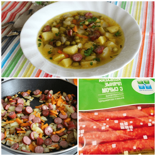 Potato soup with green peas and spicy sausages is a fragrant and hearty dish of Russian cuisine that combines simplicity and rich flavor. Its roots trace back to the traditions of village cooking, where accessible and nutritious ingredients were used. Tender potatoes, sweet green peas, and spicy sausages create a harmony of flavors, while chicken broth adds depth and richness to the soup. Sautéed vegetables add a light caramel note, and herbs at the end refresh the dish. This soup is perfect for cold days, providing comfort and warmth. It is suitable for lunch or dinner, especially with family. Simple to prepare yet rich in taste, it will quickly become a favorite in your home.