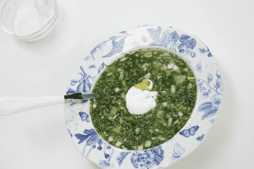 The spicy part should consist of finely chopped green onions (with onions predominating in this mix), dill, parsley, celery, and tarragon. All the greens should be finely chopped.