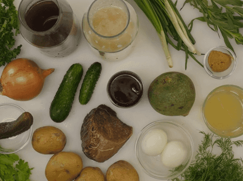 Meat okroshka according to the recipe of the pedantic William Pokhlebkin. With turnip and tarragon, on two kvasses, with cucumber brine. Russian luxury.