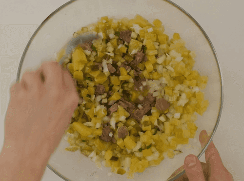 Boil the meat, swede, potatoes, and eggs separately. Let cool. Cut the meat into small cubes.
