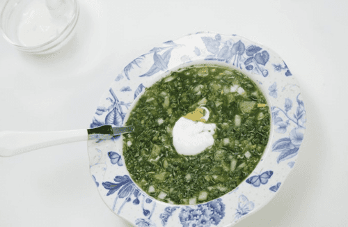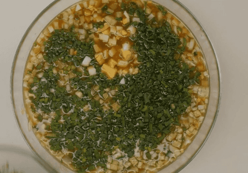 Mix all dry ingredients except for greens and eggs. Combine mustard, a third of a glass of dark kvass, and ground pepper. Pour the dressing over the okroshka, lightly mash with a spoon, and let it sit for 30 minutes.