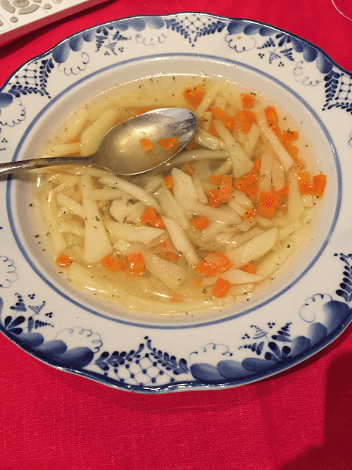 While the water is boiling, we chop the onion finely, grate the carrot on a coarse grater (can also be diced), and cut the potato into thin strips. We place the chopped potato in cold water for about 5 minutes, then rinse it three times with cold water (to remove starch – this is important for sugars).