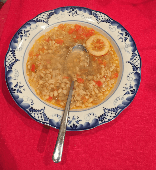 Remove the pearl barley, drain it in a colander, rinse with cold water – and add it to the soup. Cook for one and a half to two hours until the lamb is completely tender.