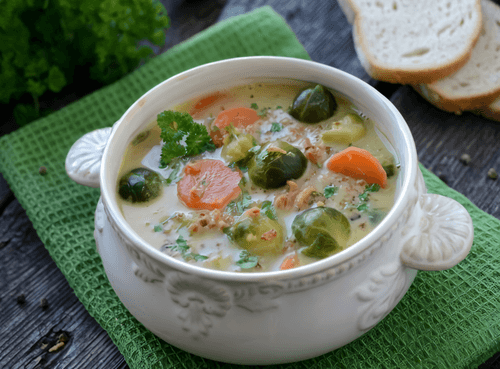 Vegetable soup with broccoli and brussels sprouts in chicken broth
