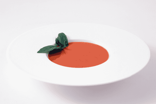 Strain the soup through a sieve. Serve garnished with a basil sprig.