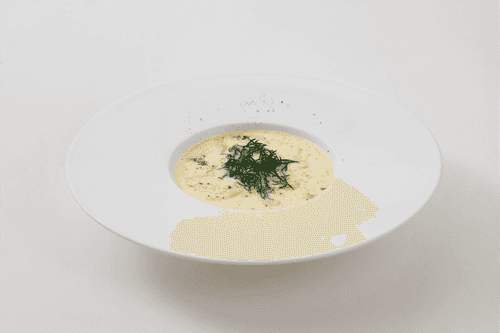 Add cream, then potatoes. Bring to a boil and remove from heat. Serve garnished with dill and truffle oil.