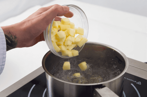 Cut the potatoes into medium cubes and boil in boiling water until half cooked.