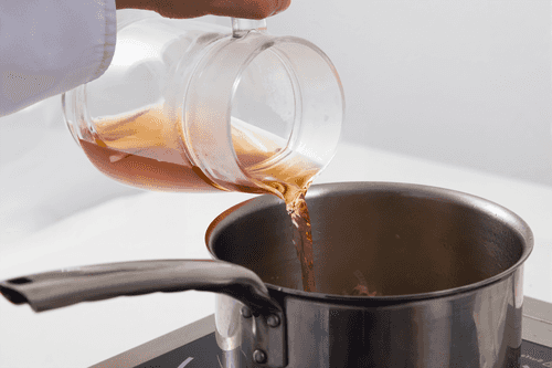 Add chanterelles to the onion and sauté everything together. Then pour in the broth, bring to a boil, and simmer for 5 minutes.