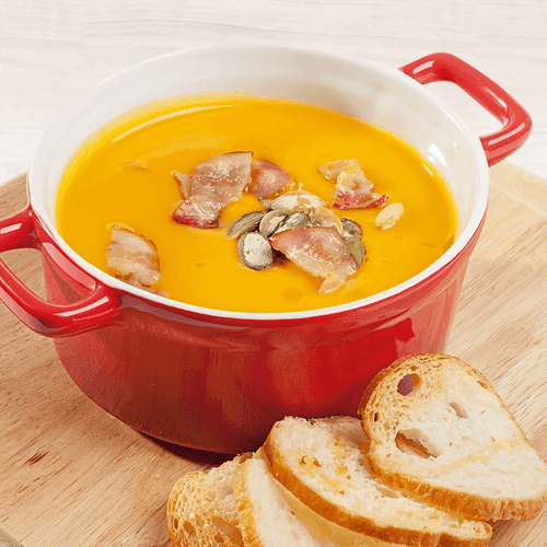 Pumpkin cream soup with ginger and bacon is a refined dish of Italian cuisine that combines the delicate sweetness of pumpkin with the spicy sharpness of ginger and the aromatic crunch of bacon. The history of this soup traces back to traditional autumn dishes when pumpkin becomes the season's main ingredient. The creamy texture is achieved through cream and careful whipping, while the addition of curry gives it a hint of exoticism. The taste is warming, velvety, with subtle spicy notes, and bacon adds a pleasant contrast. It is perfect for a cozy dinner on cool evenings. Served with crispy croutons or roasted pumpkin seeds that complete the composition. This soup is a true delight for gourmets and connoisseurs of refined gastronomy.