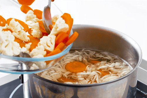 Bring the broth to a boil and add carrots, potatoes, cauliflower, and leeks, cooking until almost done.