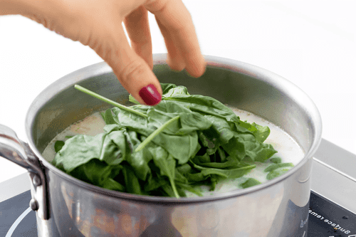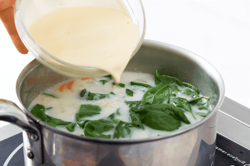 Mix the flour in the milk and pour it into the soup. Add spinach and peas, and cook for a few minutes.