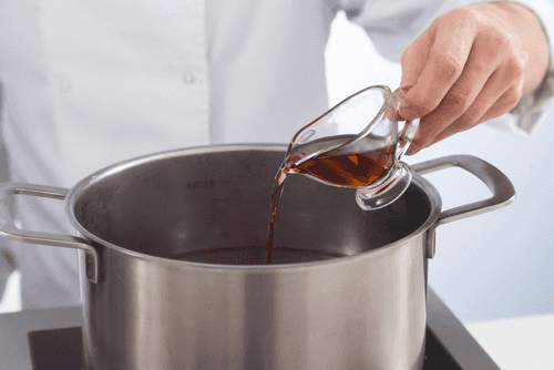 Pour three tablespoons of fish sauce into the beef broth and add four halves of onion, ginger, two sticks of cinnamon, a bit of star anise, black peppercorns, and cloves. Bring the broth to a boil and let it simmer on low heat for another thirty minutes.