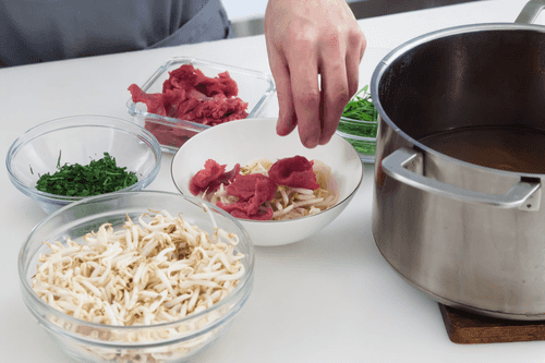 Slice the beef tenderloin into very thin pieces. Use a slotted spoon to remove the almost cooked noodles from the broth and place them on plates, adding a handful of raw beef and soybean sprouts. Pour broth over everything, sprinkle with cilantro, green onions, and squeeze lime juice on top, then serve.