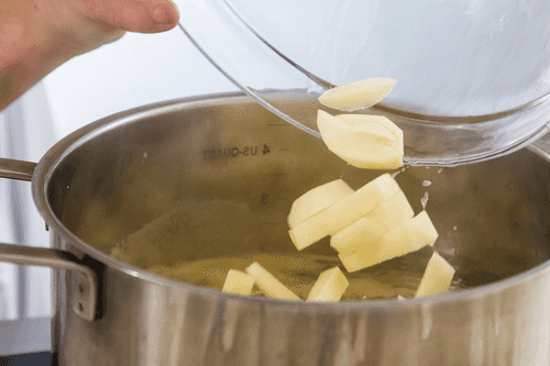 After 10-15 minutes, add potatoes and finely chopped onions and cook until the potatoes are done over medium heat.