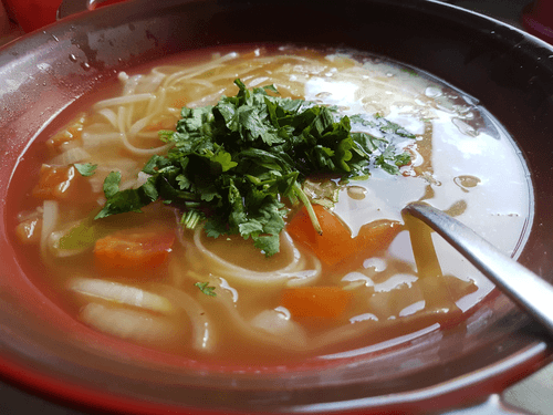 Cook rice noodles (cooks instantly in 2-3 minutes) in a strong fish/beef/chicken broth. In my case, the fish broth was made from the heads of fresh and smoked salmon. The broth was cooked with capers, ginger, celery, and tomatoes, soy, and fish sauces.
