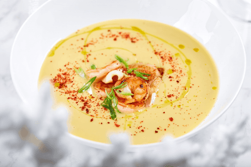 Corn chowder with seafood is a warm, rich dish from American cuisine that embodies the rich flavors of the coast. The delicate sweetness of fresh corn combines with deep sea notes of shrimp, squid, and fish, creating a harmony of flavors and textures. A light spiciness from chili and garlic gives the dish a unique character, while sesame oil adds subtle nutty undertones. The chowder has a velvety consistency due to the careful processing of vegetables and broth. This dish is perfect for cozy evenings, warming and satisfying. Garnished with herbs and aromatic spices, it becomes not only a gastronomic delight but also a visual pleasure that awakens the appetite. Traditionally served with crispy toasts or fresh bread that highlights its flavor depth.