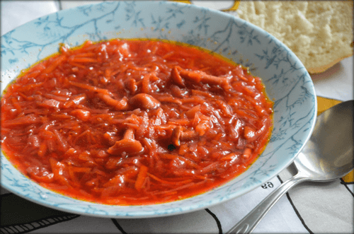 Add grated carrots, beets, apple cider vinegar, sugar, salt to the pan, and simmer until the beets are half-cooked. Separately, in another pan without oil, fry the flour and tomato paste over low heat.