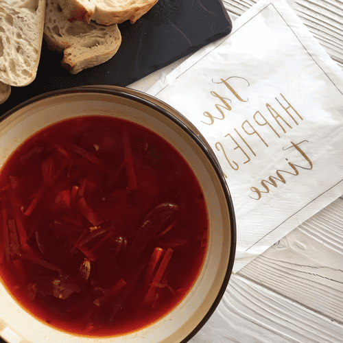 Borscht on beef broth with roasted beets is a traditional Ukrainian dish that embodies a wealth of flavors and aromas. The history of borscht dates back to ancient times when it served as a symbol of home comfort and hospitality. This version with roasted beets features a deep rich color and subtle caramelized notes. Beef broth gives the borscht density and richness, while fresh vegetables provide a balance of flavors and textures. It is served hot with sour cream and golden garlic pampushka, adding warmth to the meal. Borscht not only satisfies hunger but warms the soul and brings people together at the table. It reveals its best flavors the day after cooking when the ingredients exchange aromas, creating perfect harmony of tastes.