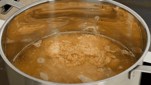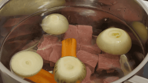 Cut the meat into large pieces. Submerge it in 5 liters of water, adding a large carrot and two onions.