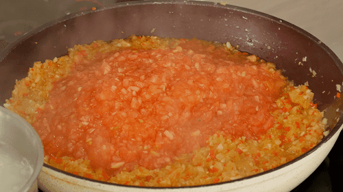 Add finely chopped garlic and hot pepper. Sauté for 5 minutes, then add peeled chopped tomatoes and sauté for another 5 minutes.