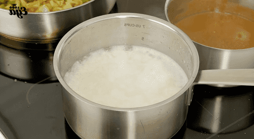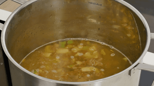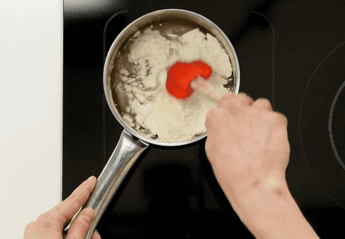Pour the broth into the soup pot, add the roux (flour mixture), and mix well.