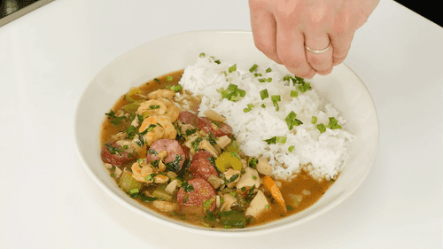 Serve the gumbo warm, pouring it over cooked rice.