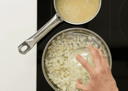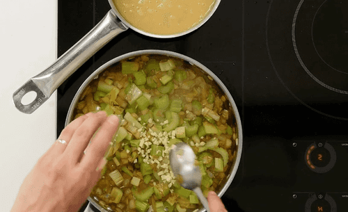 In the same pan with the remaining fat from the sausage, fry the onion and celery.
