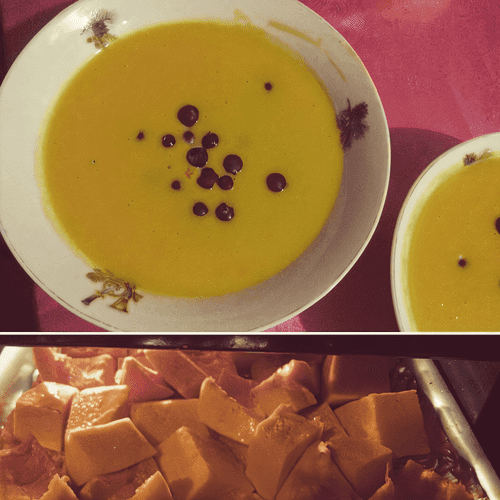 Cut the pumpkin into large cubes, drizzle with vegetable oil, season with salt and pepper, and place in an oven preheated to 200 degrees for 25 minutes covered with foil. Remove the foil 10 minutes before it's done.