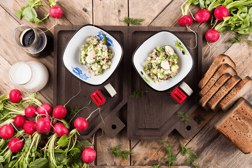Okroshka with matsoni is a refreshing and nutritious cold soup that comes from Russian culinary tradition but enriched with Georgian matsoni, giving the dish an extraordinary tenderness and slight sourness. In this version of the classic summer soup, fresh crunchy vegetables intertwine with nutritious beef tongue and a spicy paste of yolks, mustard, and sour cream. Mineral water makes the texture especially airy, while the garnish of quail eggs and green onions adds aesthetic completeness. Okroshka with matsoni is perfect for hot days when one desires lightness and freshness. This dish can be served as a standalone refreshing lunch or as part of a feast, showcasing the harmony of traditional flavors and original culinary solutions.