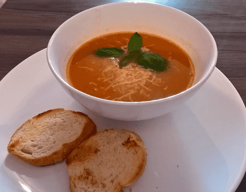 Serve sprinkled with grated Parmesan, garlic, and garnished with basil leaves. You can serve a couple of toasted slices of baguette rubbed with garlic with the soup.