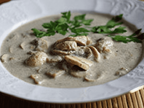 Mushroom soup with wine is a refined dish of European cuisine, combining the rich aroma of white mushrooms and the subtle depth of white wine. Its history roots in the traditions of French and Italian gastronomy, where the combination of mushrooms and wine creates a harmonious bouquet of flavors. Thick and velvety due to cream, it has a delicate texture and a noble hint of thyme. This soup warms wonderfully in cool weather and is perfect for a cozy dinner with a glass of white wine. It can be served as a standalone dish or paired with crispy baguette, enhancing the gastronomic pleasure. This is not just soup — it is a true culinary masterpiece that delights with its taste and aroma.