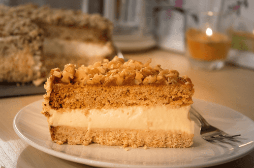 Heat the boiled condensed milk in a water bath so you can easily spread it on the top layer. Finally, sprinkle the pie with walnuts to taste.