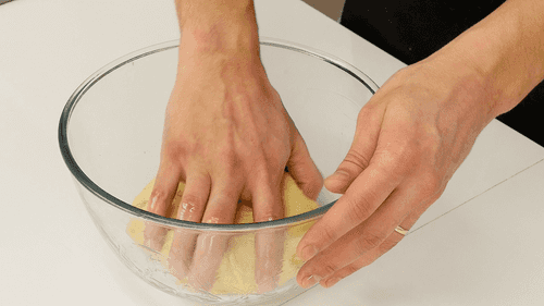 The dough should pull away from the sides of the bowl but not be too stiff. If the dough is too runny, add another 20-30 g of flour.