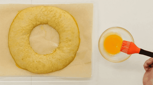 Knead the risen dough and shape it into a ring. Place it on a baking sheet lined with parchment paper, cover with a towel, and let it sit in a warm place for another 30-60 minutes.