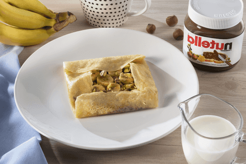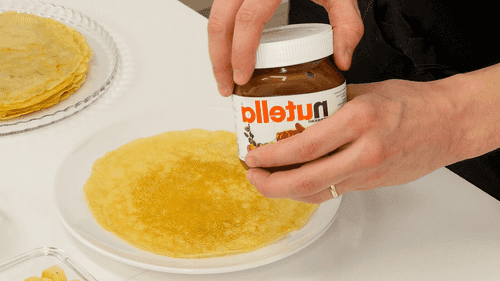 Place a pancake on a plate, spread Nutella® on it, add a few banana slices on top, and sprinkle with chopped pistachios.