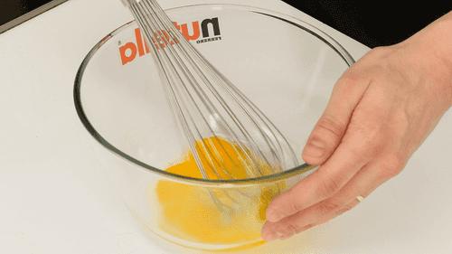 Beat the eggs with salt using a mixer until light foam forms. While continuing to beat, pour in boiling water and kefir.