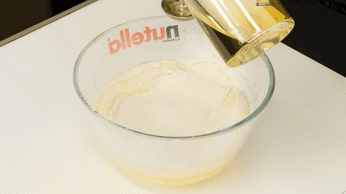 Sift the flour with baking soda and gradually add it to the mixer bowl, mixing at low speed. Add sugar and vegetable oil.