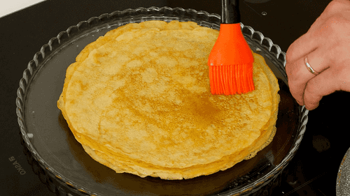 Grease a heated pan with a little oil and fry the pancakes on both sides until golden brown. Brush the finished pancakes with melted butter to maintain elasticity.