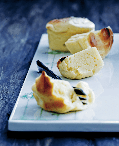 Pour the batter into 12–16 small fireproof molds greased with butter. Bake in a water bath: place the molds in a baking tray with edges, pour boiling water from a kettle into it until it reaches the middle of the mold walls. Place in an oven preheated to 180 °C for 30–35 minutes: the batter should turn into a soufflé.