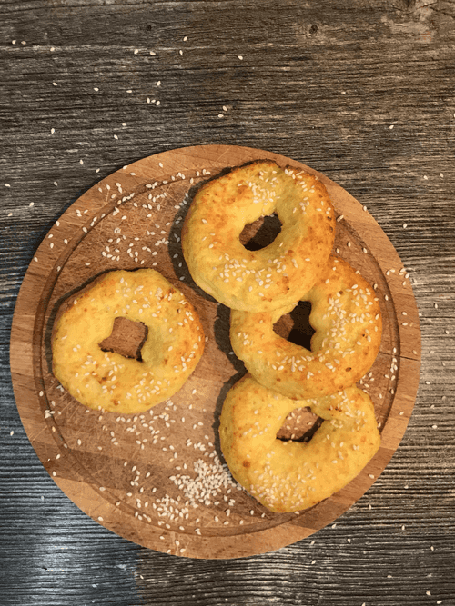 Place the bagels on a baking sheet and sprinkle them with sesame seeds. Bake for 30 minutes at 180 degrees.