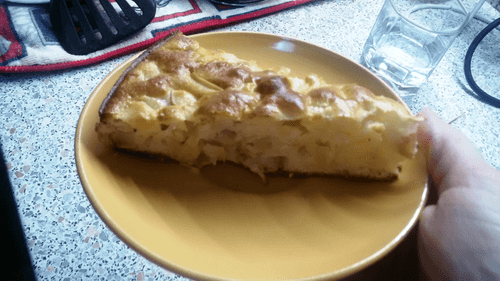 Mix the apples with the dough and spread this mixture in a baking dish.