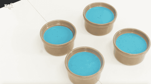 Slightly squeeze out water from the soaked gelatin and add it to the hot cream, also add blue dye, just a little to make the cream blue or light blue. Mix well until the gelatin dissolves.