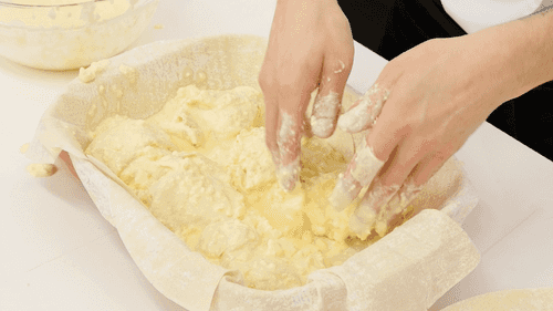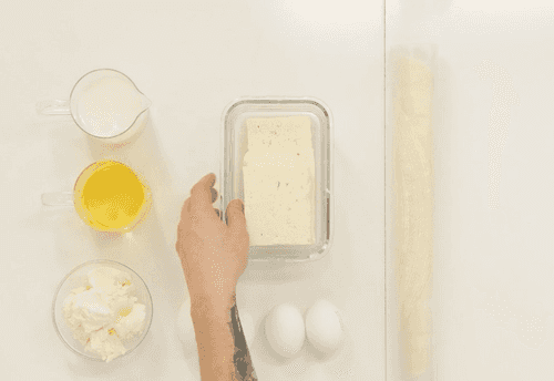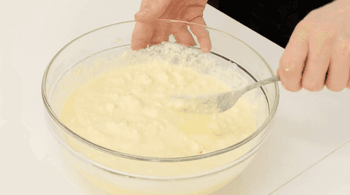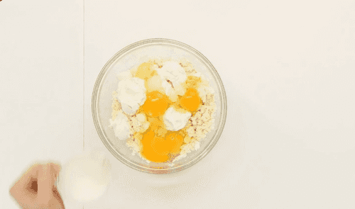 Mix it with sour cream, eggs, and milk. The mixture should be uneven, with chunks of cheese.