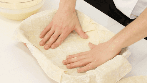 Set aside 2 sheets of dough to cover the pie. Soak the remaining dough one sheet at a time in the egg-cheese mixture and place wet clumps into the mold. If there is leftover mixture, pour it into the mold.