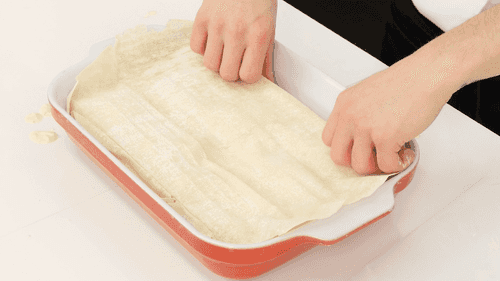 Grease the baking dish with vegetable oil and lay 4 sheets of phyllo dough in it, leaving the edges hanging.