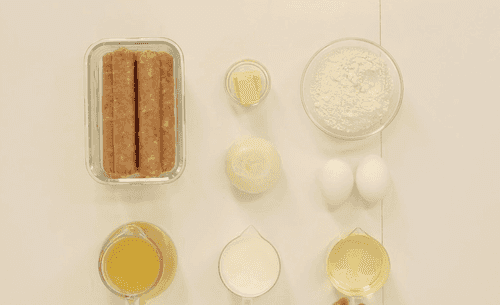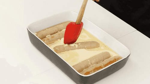 Quickly pour the batter into the mold over the hot sausages, partially covering them. Bake in the oven for 30 minutes until the batter rises and the sausages turn golden brown.