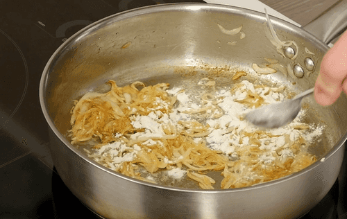 Then add a tablespoon of flour, mix for a minute, pour in the broth, bring to a boil, reduce heat and let it sit for 10-15 minutes. Season with salt to taste. Serve hot pudding with onion sauce.