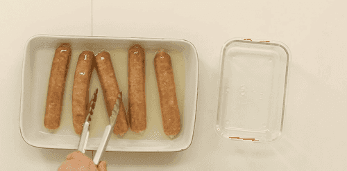 Then place the sausages in the dish, covering them with oil on all sides and piercing them in several places with a skewer to prevent them from bursting during cooking. Place the dish back in the oven for another 10 minutes.