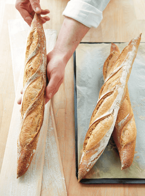 On another baking tray lined with parchment paper, carefully place the dough pieces seam side down. Sprinkle them with flour and make 4 diagonal cuts on each at equal distances from each other. Before starting to bake, pour 50 ml of water into the preheated tray that is already in the oven on the lower level. Place the baguettes in the oven and bake for 20 minutes.