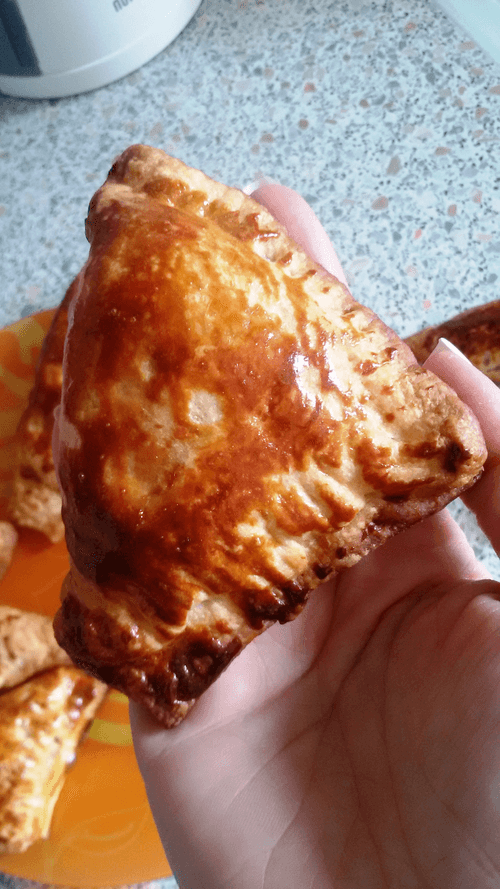Roll out the dough on a floured surface and cut into squares. Place 1-1.5 tablespoons of filling in each square and fold into a triangle.